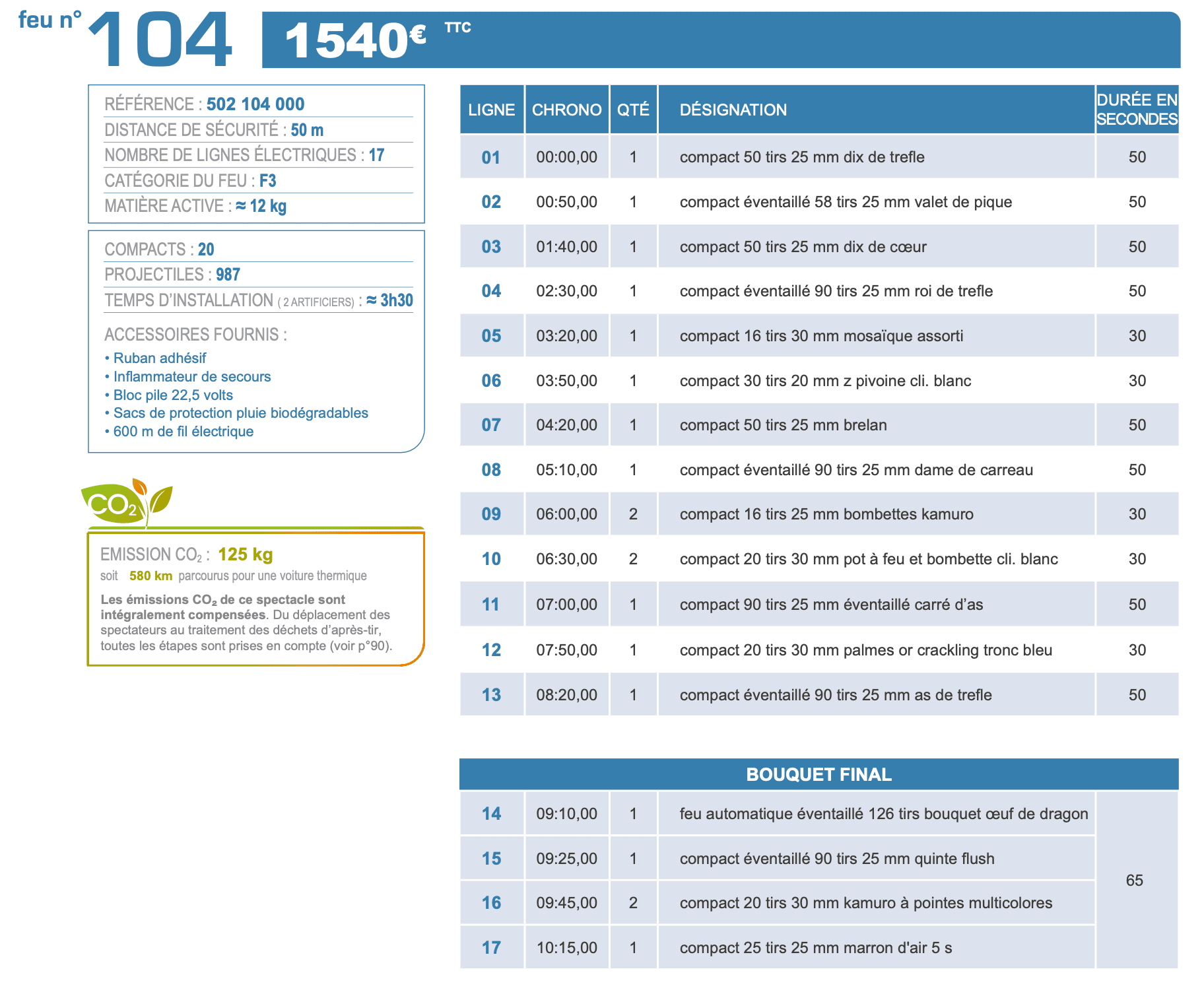 Les produits utilisés pour concevoir le spectacle varient selon les stocks disponibles. Le rapport qualité prix / durée est maintenu lors des changements.