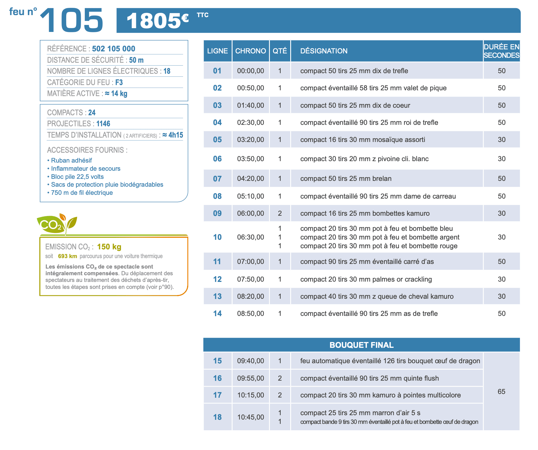 Renforcer le bouquet, ajouter un tableau pour plus de durée, intégrer une séquence bleu, blanc et rouge pour la fête nationale grâce aux options de personnalisation des feux.