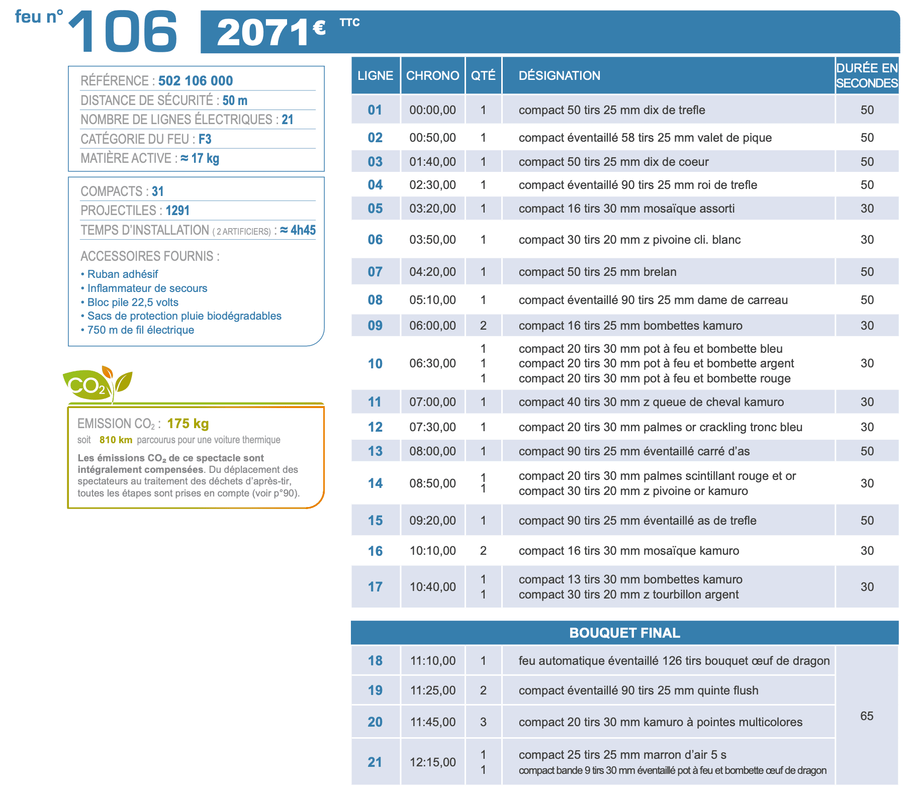 Le feu d'artifice 106 est un spectacle fait de pièces d'artifice type compact. Les compacts sont à installer un à un au sol, à fixer, à brancher puis à tirer. Un travail relativement long mais qui offre à vos spectateurs d'un soir un spectacle pyrotechnique digne d'un artificier professionnel. Le bouquet final est dense, la durée est conforme à l'idée que l'on se fait des feux d'artifice, et la diversité des effets est au rendez-vous.