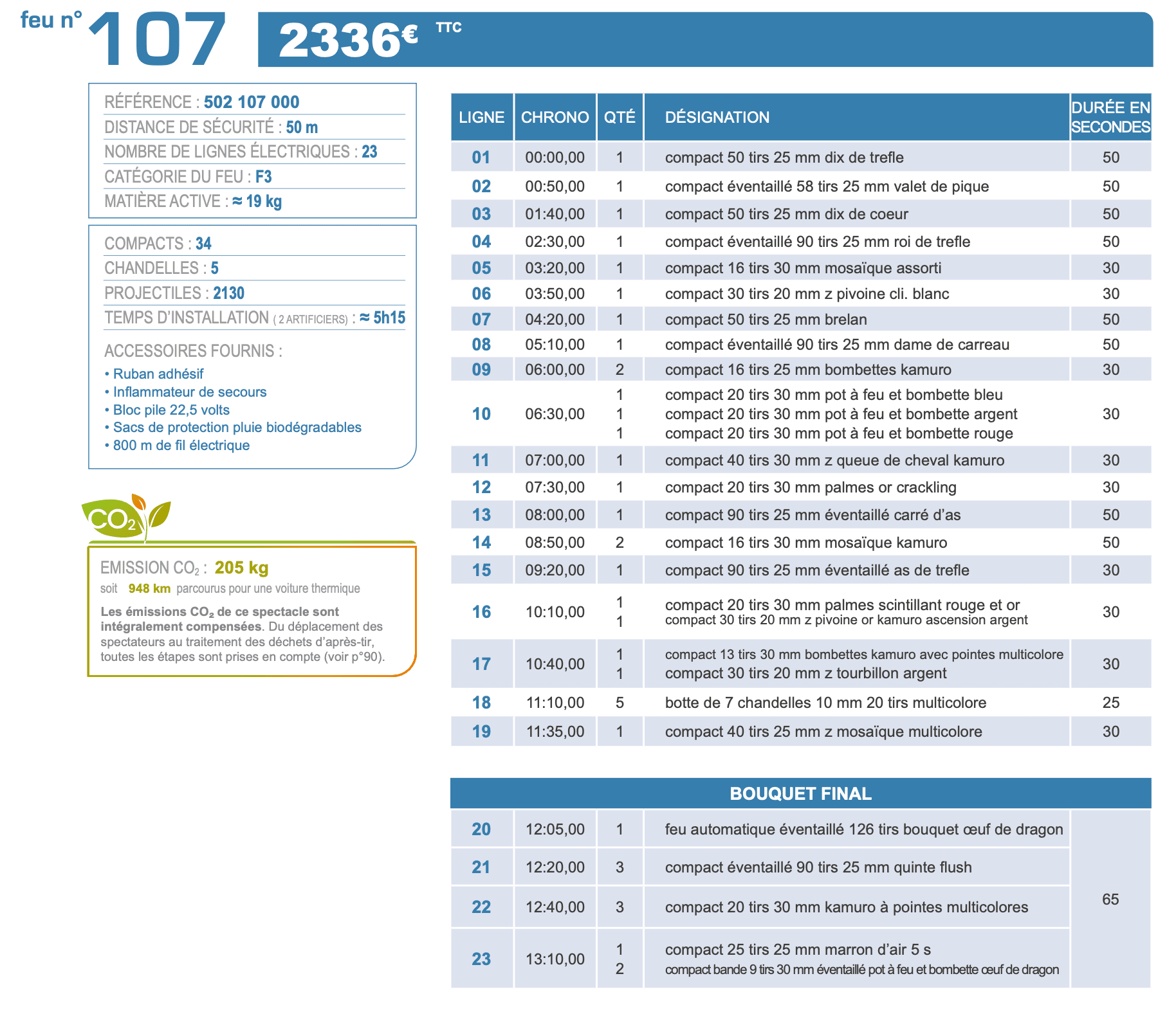 Le feu d'artifice 107 est un modèle issu de notre collection "sans formalité". Un spectacle pyrotechnique destiné aux communes, particuliers ou associations désireux d'offrir un spectacle complet aux spectateurs. Sans formalité administrative, le tir n'est pour autant simple sans connaissance. En effet chaque pièce (compact) est à installer et brancher à un pupitre de tir. Le déclenchement se fait à l'aide d'électricité et le tireur doit déclencher les lignes une à une le soir venu. Un vrai travail d'artificier destiné aux connaisseurs.