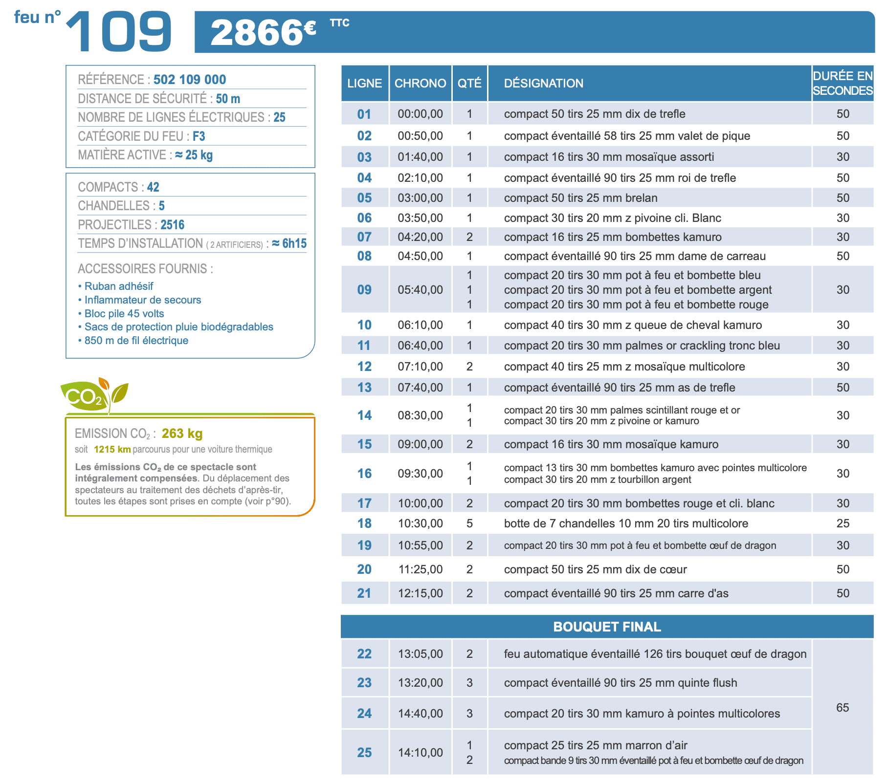 Les produits utilisés pour concevoir le spectacle varient selon les stocks disponibles. Le rapport qualité prix / durée est maintenu lors des changements.