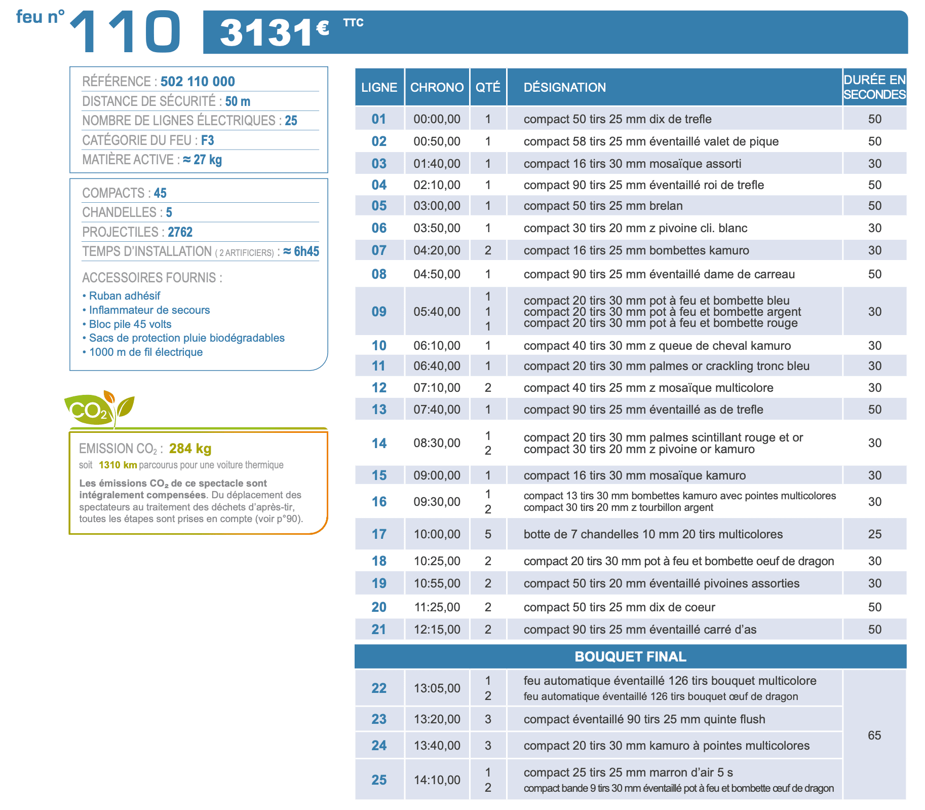 Le grand modèle 110 de feu d'artifice sans formation mais pas sans installation. Chaque pièce de feu d'artifice doit être installée, chaque compact doit être branché. Les pièces les plus instables doivent être fixées. Le public doit être placé à environ 50 mètres du spectacle pour un confort optimal. Le bouquet final grandiose et les séquences les plus gourmandes ne sont pas le fruit du hasard. En effet l'artificier devra maîtriser le branchement électrique en série pour réussir de telles séquences. Un travail de quelques heures est nécessaire pour l'installation complète du feu d'artifice 110.