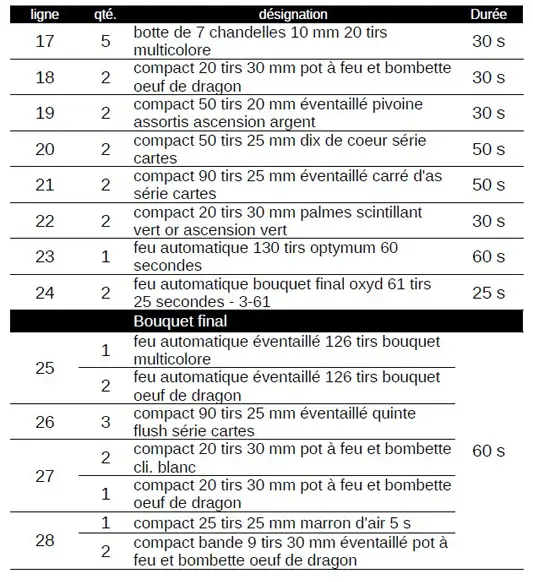 La durée peut varier de plus ou moins 20%. Chaque artifice est composé de nombreuses mèches qui peuvent présenter des lenteurs ou au contraire des moments de folie.