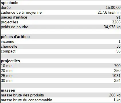 La durée peut varier de plus ou moins 20%. Chaque artifice est composé de nombreuses mèches qui peuvent présenter des lenteurs ou au contraire des moments de folie.