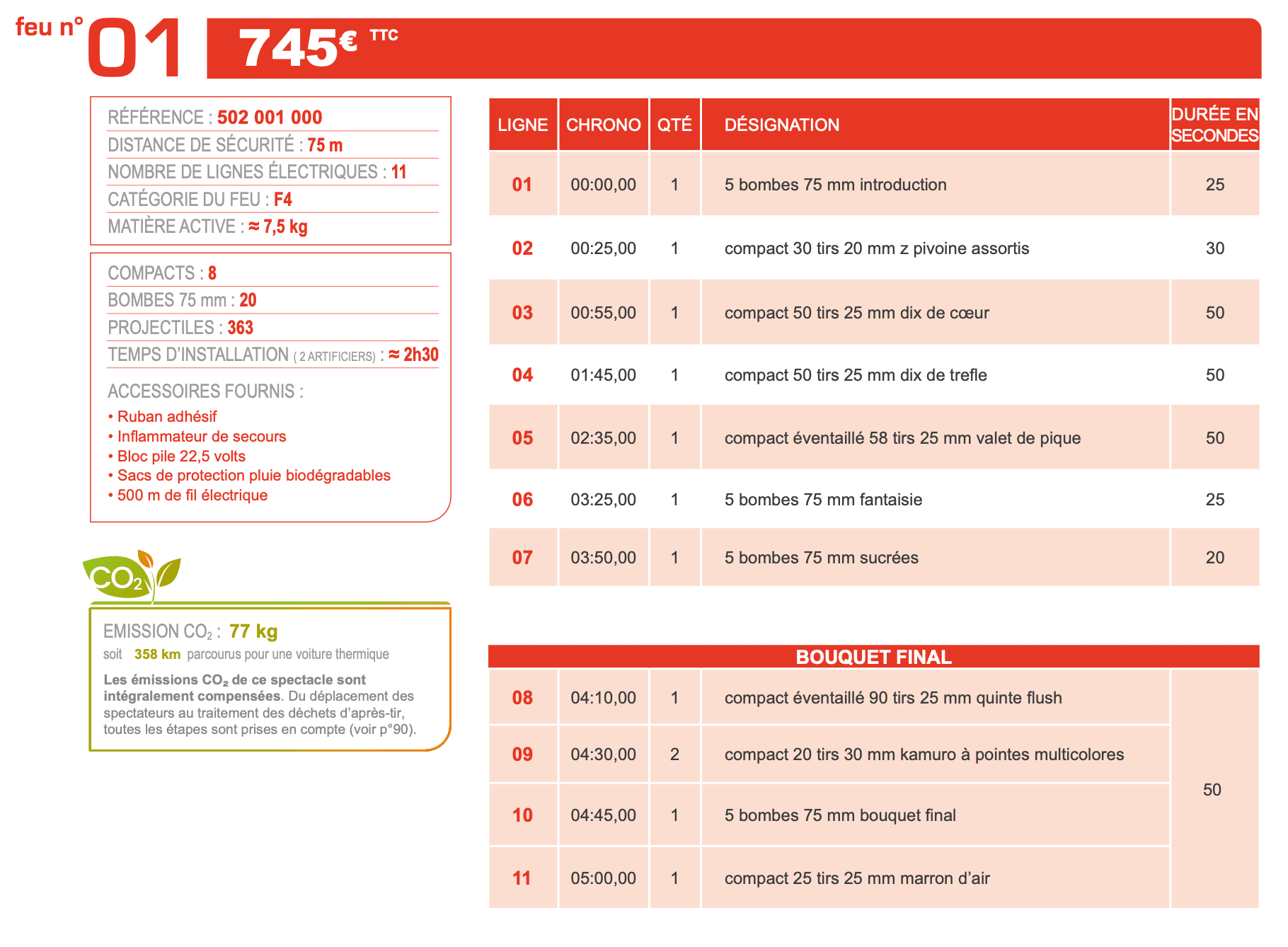 Le premier prix de notre collection de feux d'artifice à installer de A à Z. Composé de bombes et compacts, il apporte la satisfaction de voir une grande palette d'effets pyrotechniques. Ce spectacle nécessite une mise en oeuvre par un artificier qualifié F4T2. Principalement destiné aux collectivités et associations, il est un vrai succès qui perdure dans le temps.