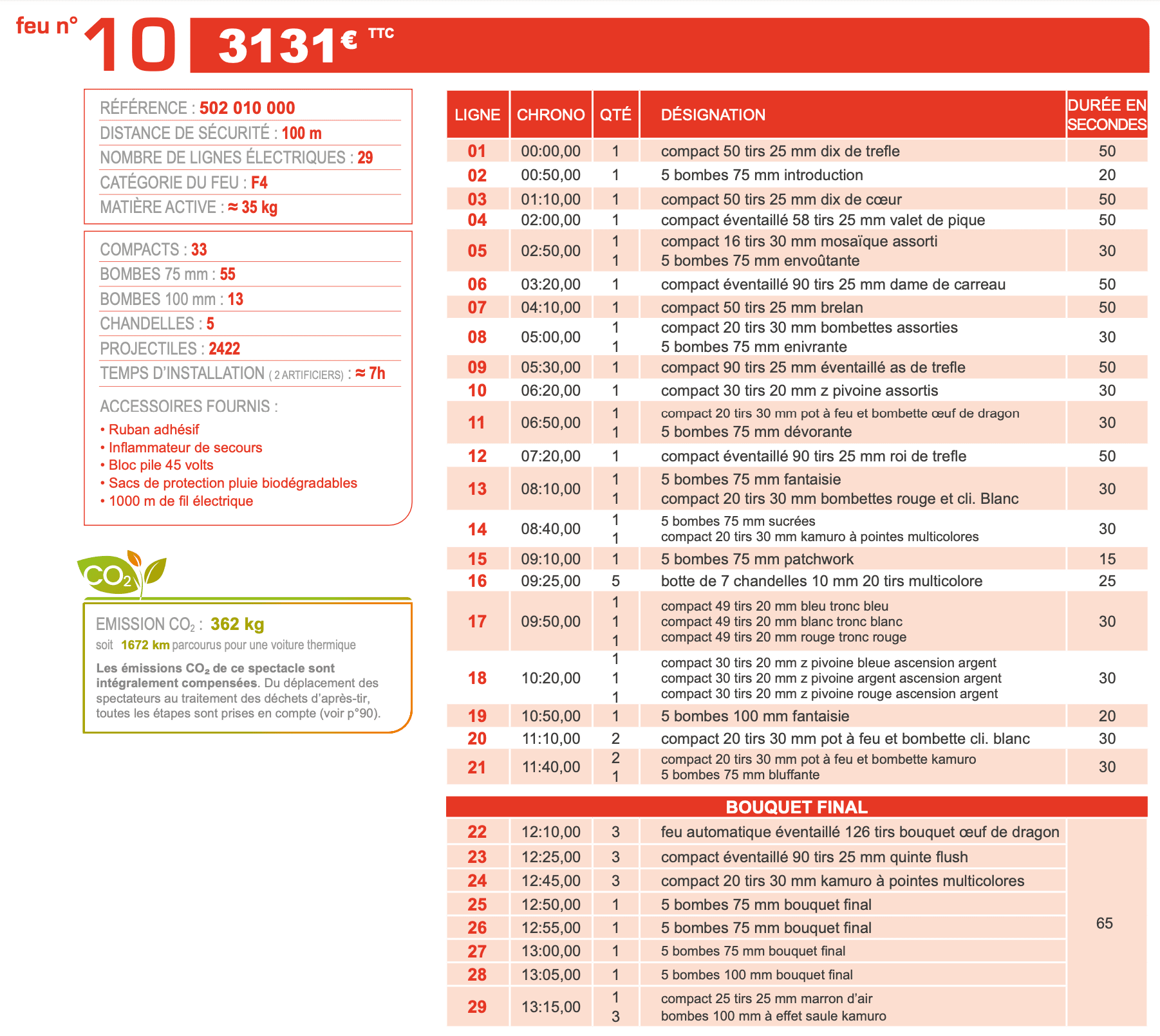 Le plus grand spectacle de la gamme des feux d'artifice catalogue pour collectivité signature Jacques PREVOT. Un spectacle long, dense, dynamique et relativement exhaustif des effets classiques des feux d'artifice. Un spectacle dont l'artificier qualifié F4T2 pour faire sien le programme en l'adaptant à ses goûts. La durée du spectacle est toujours fonction de la rapidité du tireur. Cette durée peut varier selon le comportement plus ou moins lent de certains compacts.