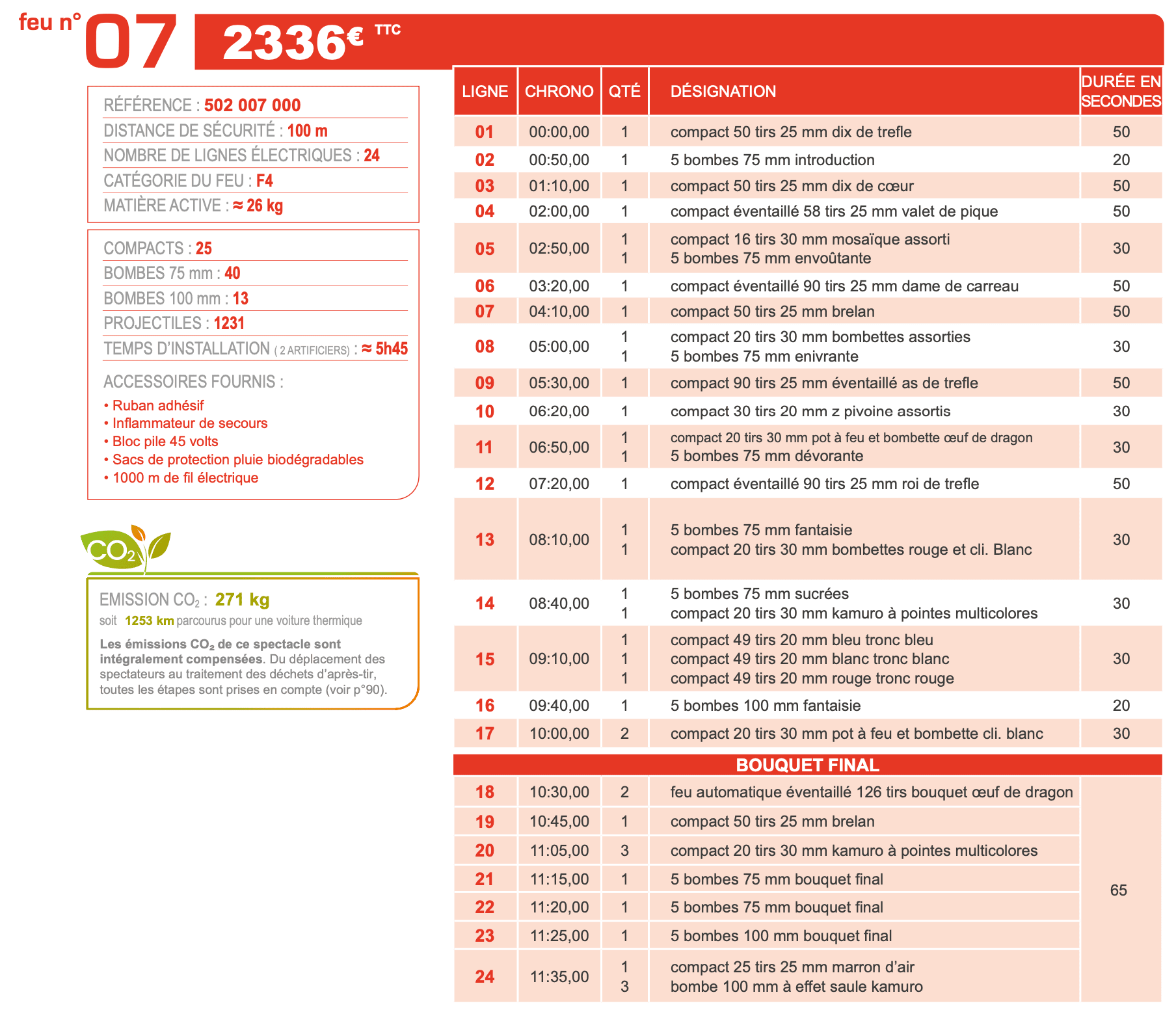 Un spectacle identique au modèle numéro 6 dans sa structure, mais qui voit son bouquet final et son tableau "nouveau royaume" renforcés. La durée atteinte de 12 minutes environ est selon nous un excellent ratio pour un feu d'artifice présenté à un public. Un spectacle qui peut être complété par des pièces supplémentaires ou des options complémentaires comme un renforcement de bouquet final ou un tableau supplémentaire.