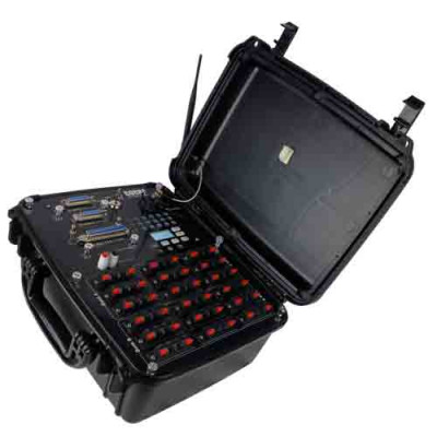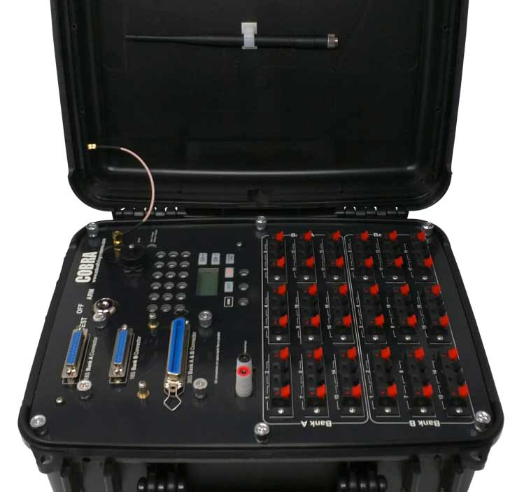 Boîtier 36 lignes pour système de tir Cobra. Le boîtier est dans une caisse de protection de couleur noire. Fonctionne sur batterie LIPO (fournie). Matériel neuf.